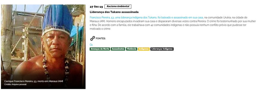 Em setembro de 2019, na região do Vale do Javari, Maxciel Pereira dos Santos, servidor ligado à Funai, foi executado com um tiro na nuca em uma rua movimentada. O @INAindigenista