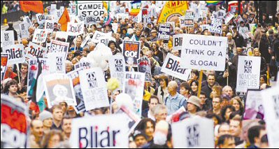 protestando contra os desmandos de Bush, de Blair - chamado de Bliar - e sua corja.
