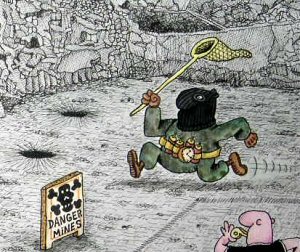 Alguns leitores nao conseguiram distinguir o detalhe do que estava escrito na placa, dificultando o entendimento do cartum, portanto aí vai uma ampliaçao: